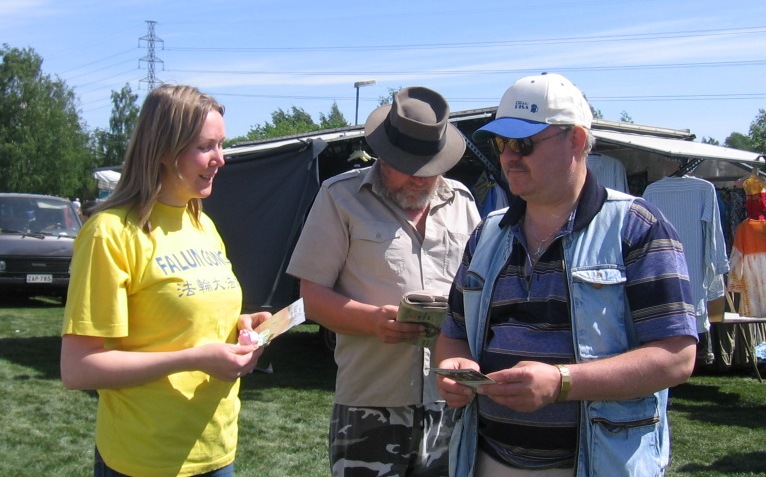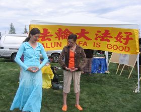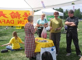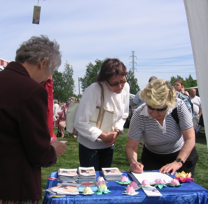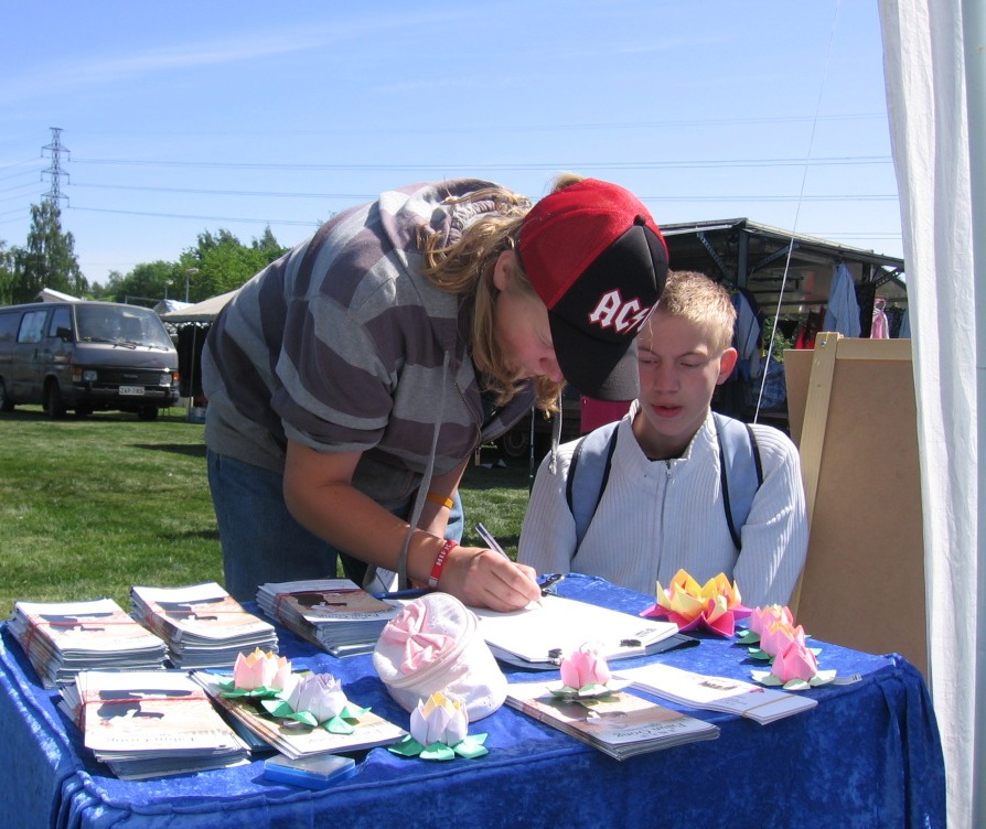 许多人走到法轮功学员的摊位前,有的看展板,有的欣赏学员舒缓的炼功演示,还有人当场学炼;更有很多人是被美丽的莲花引领到法轮功的展台前的。法轮功学员递上洪法传单,赠送莲花,讲解什么是法轮功、法轮功洪传世界和九年来中共邪*党-迫害的真相,吁请人们签名制止迫害。