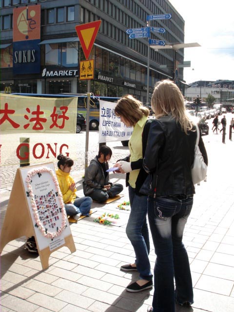 活动过程当中,有间歇的阵阵雷声,晴朗的天空飘过一些乌云,下了短暂的阵雨。一位芬兰老太太和法轮功学员Sinikka说:“你们在这里纪念这些在迫害中死去的法轮功修炼者。天上也雷声滚滚,并下起了小雨。就好象天也和你们一样悲伤。”