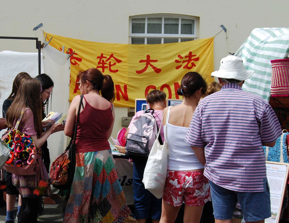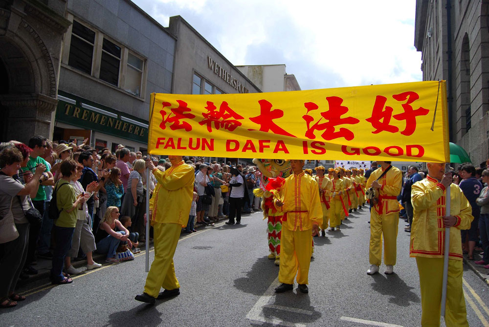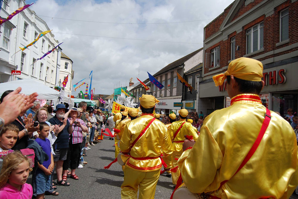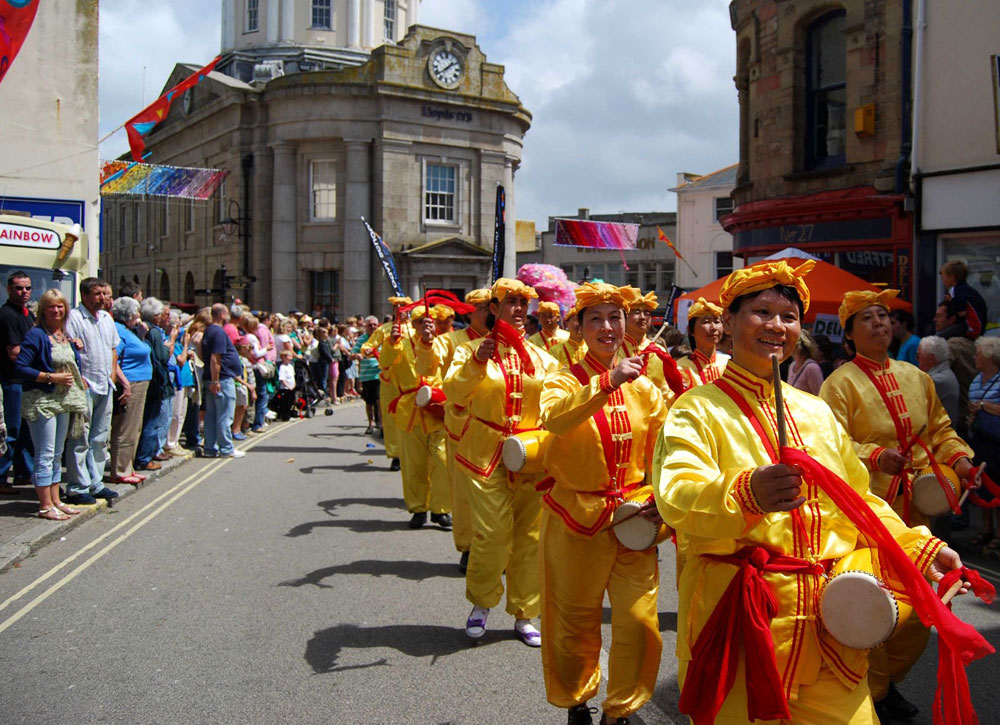 潘冉斯市是英国久负盛名的海滨度假城市,位于英国大陆最西南端的盘威斯(Penwith)地区,铁路线铺到这里就到头了。仲夏艺术节的宗旨是提倡康沃地区传统文化,所以在艺术节最热闹的大游行这天,游行队伍中有潘冉斯及周边地区各小学的学生们身着各式传统服饰参加游行。今年,法轮功学员也参加了艺术节,作为艺术节大游行的队伍之一和潘冉斯居民一起庆祝节日,也设置了真相信息介绍展位,讲清法轮功真相及遭受中共群体灭绝性迫害的事实。