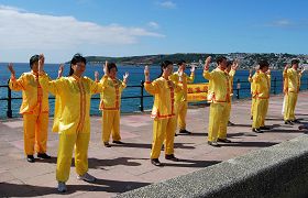 ![]() 学员们来到潘冉斯的海滨道展示法轮功功法 |