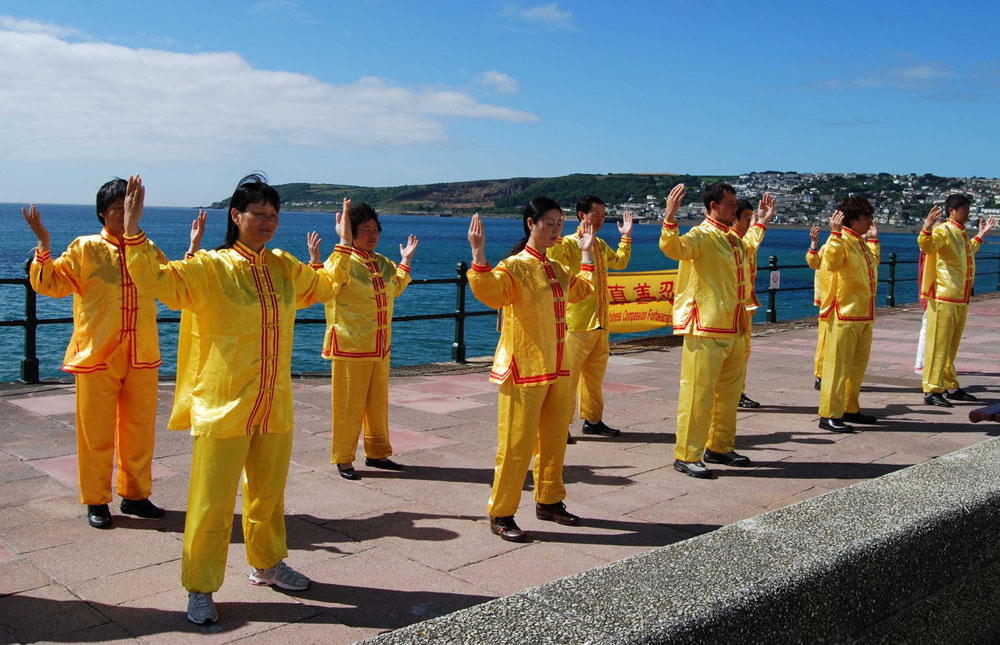 有位女士向学员表示有兴趣学功。潘冉斯虽远在英国的西南一隅,但这里也有炼功点,每天早晨学员都在公园炼功并义务教功。这位女士表示她不住在潘冉斯,当得知从法轮大法网站上可以免费下载法轮功书籍和五套功法录像时,她开心的拿着真相传单离去。