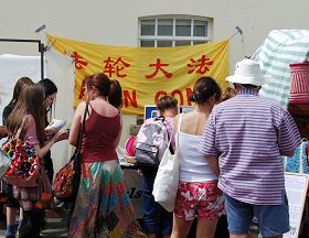 第二天,六月二十九日,学员们在艺术节摊位区设置了法轮功真相信息介绍展位,向人们介绍什么是法轮功以及发生在中国的中共邪恶政权对善良法轮功学员长达九年的残酷迫害。同时,部份学员们来到潘冉斯的海滨道炼功、洪法。