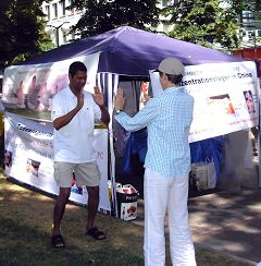 在一天的信息活动中,有看了图片后随即签名表示支持法轮功的高中生,也有以前了解过法轮功学员受迫害真相,这次向学员了解如何能帮助制止迫害的老妈妈,有在中国工作,表示要告诉自己在中国的同事去了解迫害真相的老先生,也有因为西藏问题而关注中国人权现状,认为中共迫害不可理喻的年轻人。通过和学员的交谈,通过得到的材料及《·九·评*共产党》,越来越多的人了解了真相。