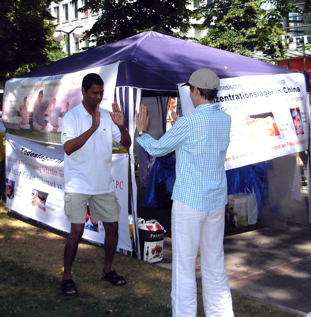 而来自印度,住在瑞士的Lino先生则当场就学起了功法。他高兴的说:“我在瑞士的电视台上看到了关于法轮功的报道,觉的功法非常平静,当时就想,我也要炼。”周六一次偶然的散步让他看到了法轮功的信息摊位。法轮功学员Manu表示可以当场教他五套功法,于是他就开始学炼了。