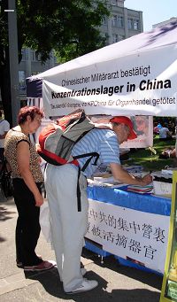 室内建筑师Michael来自汉堡,已经在瑞士居住了十五年了,他也是第一次听说法轮功的消息。写有:“军医证实:在中共的集中营里,法轮功学员被活摘器官”的横幅触动了他。在签名后他表示:“我非常愿意支持(法轮功学员)。特别是那集中营,作为一个德国人,我觉的特别糟糕,也非常反对这样的事情。”他表示自己会上网查询更多的信息,当然也会告诉其他认识的人关于正在中国发生的事。