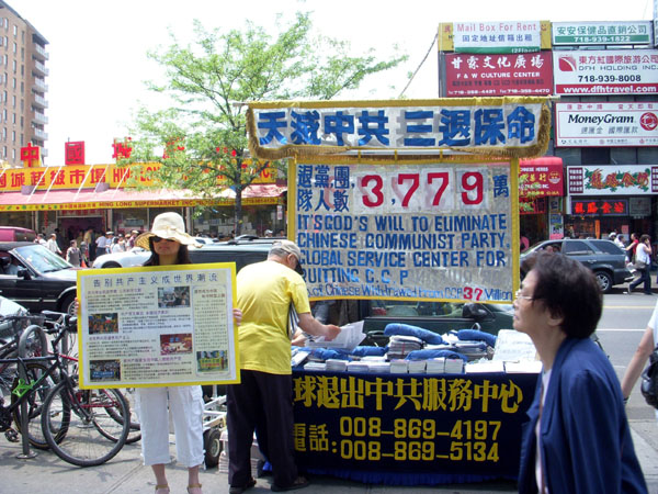 ![]() 六月三日在当地法拉盛民众的声援、警察局的支持和保护下,退!党!服务站又回到法拉盛图书馆前,同时在法拉盛民众聚集地再增设另外四个退!党!服务站。 |