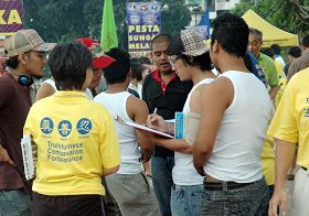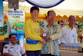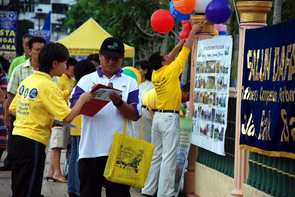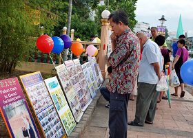 ![]() 马六甲州首席部长(中)也前来了解法轮功。他在离开前不忘带走一份真相资料 |