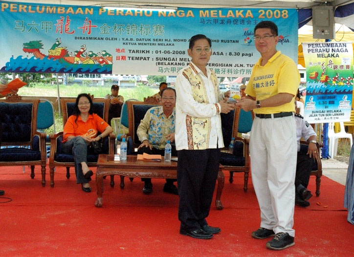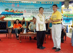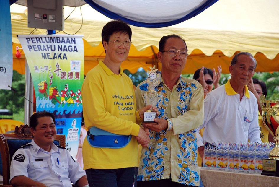![]() 主办方副会长林日华 (左)颁发纪念奖给吉隆坡法轮大法龙舟队(男子队) |