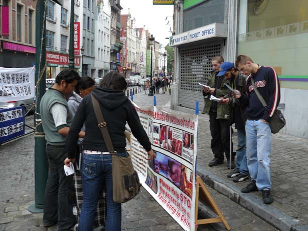 ![]() 人们认真观看中共残酷迫害法轮功的展板和传单 |