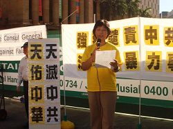 一位布里斯本退!党!服务中心的义工张女士亲身经历了法拉盛围攻事件,她表示:我们想告诉当地的华人,中共在四川大地震这件事情上是如何欺骗自己的老百姓的。我们想让大家知道实际上这场大地震,人祸的成份甚至大于天灾。因为我刚刚从美国的法拉盛回来,在那边也是因为退!党!服务中心被中共组织的暴徒去攻击,当时我本人在那边的时候也是好几次受到围攻。我们只是想让大家知道,中共不等于中国,中共是中国灾难的根源。