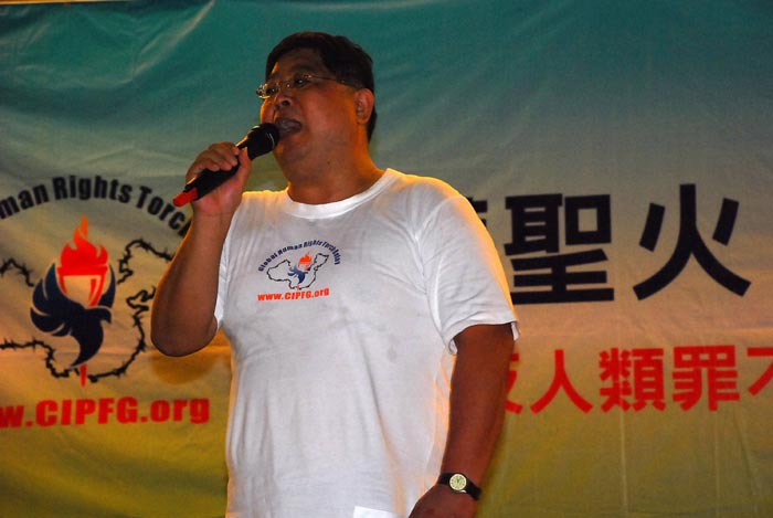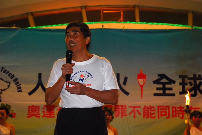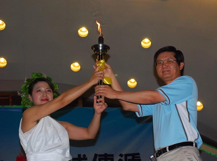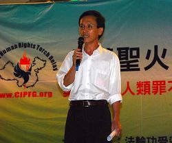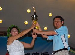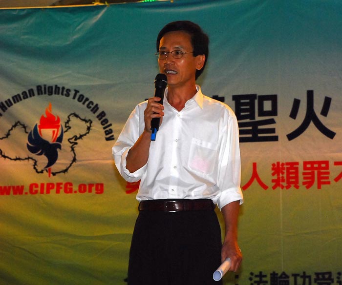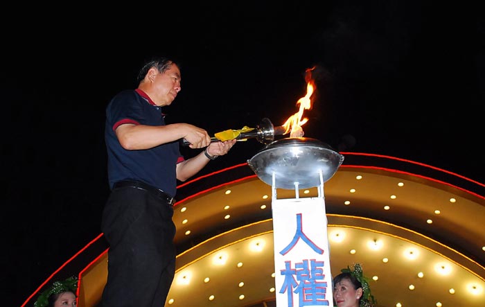 立法委员江义雄举起圣火点燃圣火台,他呼吁民众共同制止中共对法轮功的迫害。