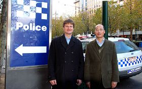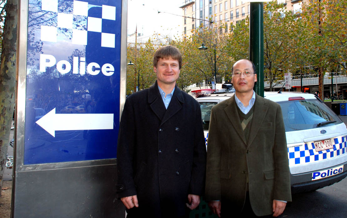 ![]() 澳大利亚维省法轮大法协会的两位负责人在维省警察总署门前 |