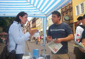在退!党!摊位上,人们可以得到揭露中共邪恶本质的《·九·评*共产党》一书、关于法轮功无辜被中共迫害的信息、还可以签名反对迫害,更有中国人利用这个机会签名退出中共党团队组织。