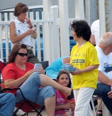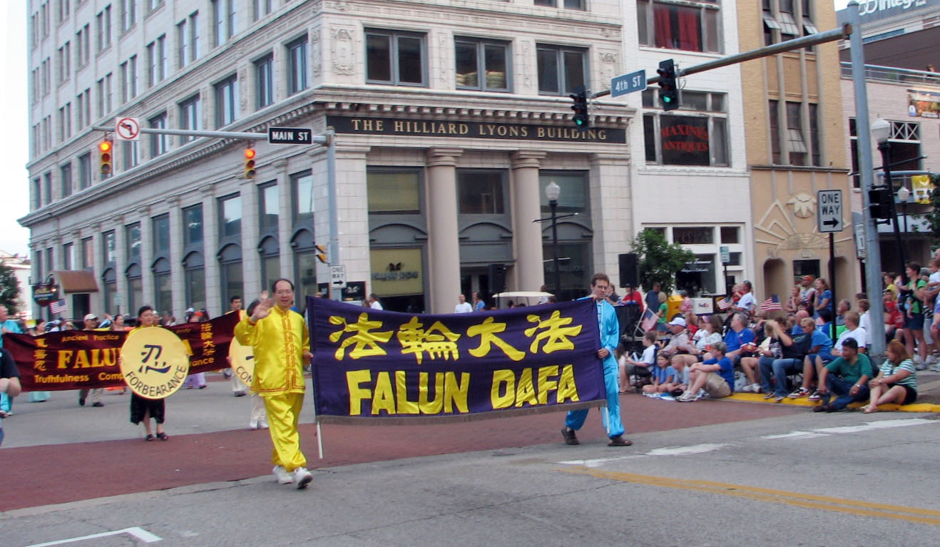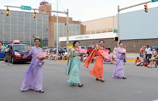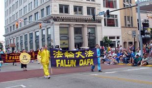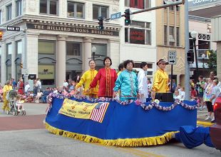 初夏的落日余晖映衬下,伊万斯威尔市显得格外美丽朴实。六时许,游行开始。近百个参与团体精心的把花车妆点的亮丽多彩。当法轮功队伍出现在人们面前时,观众们眼睛为之一亮:几面大横幅上写着中英文“法轮大法”;漂亮的黄色牌匾上是醒目的“真善忍”;花车上,学员身着炼功服表演着缓慢优雅的法轮功五套功法;“仙女们”手持莲花向观众招手致意……