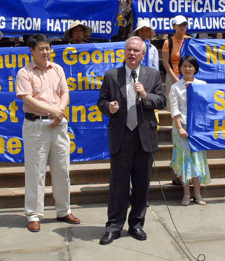 ![]() 纽约市议员埃维拉(Tony Avella)表示:“我们不能容忍在有言论、信仰和集会自由的美国,发生这种对法轮功学员的人身攻击。” |