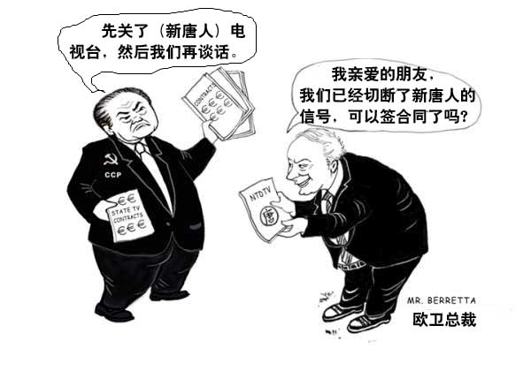 记者无疆界表示,新!唐!人:电视台的节目激怒了中共政权,因为通过卫星,数以百万计的中国人可以看到新!唐!人:电视台的节目。欧卫在奥运会的前几周中断新!唐!人:的节目,是因为欧卫为了获得新的交易。欧卫在二零零五年就曾试图关闭新!唐!人:的信号,当时迫于国际压力,欧卫才签了新的合同。