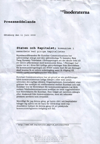 对利润的渴望,使欧卫公司成为中共的奴仆(或用列宁的话说:是“有用的傻瓜”)。记者无疆界组织公布了一个电话录音。这个录音揭露了欧卫公司出卖良心,按照中共的意愿中断新!唐!人:卫星信号,并对外谎称是技术原因所致。”