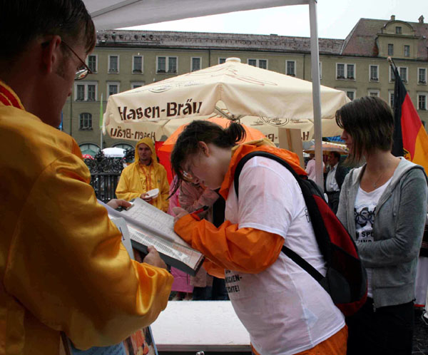 有一组身穿无疆界记者设计的手铐奥运T-恤衫的中学生,来到法轮功学员的信息台前,主动要求在“全球百万人签名 北京奥运前停止迫害法轮功”的签名簿上签名。当天,很多明白真相的人们也纷纷在此签名。
