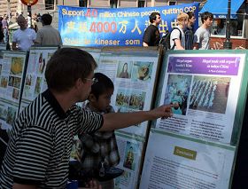 劳伦斯(Laurence)是个开朗、热情的法国人,她是来瑞典旅游的,当她看到眼前的场景很是吃惊。她说,“你们做的这个事(指退!党!和揭露迫害)太好了”!她站在真相展板前默默的看了很久并不停的拍照。原来她去过三次中国。她非常热爱中国和那里的人们,她周围还有几个西藏的朋友,很了解中国糟糕的人权状况。十分清楚中国人在中共统治下那种痛苦不堪的生活,她自己还录了一些警车,警察、保安的真实录像,但当她看到中共活摘法轮功学员器官的暴行时,还是感到十分的震惊和气愤,她说,没去过中国是很难想象出在中国正在发生的这些事情。但我知道住在中国的人他们是不会知道这些的(真相),因为媒体是被封锁的,根本不会报导。