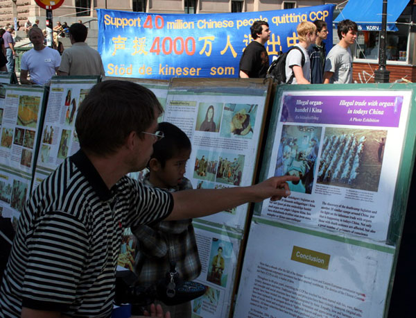 活动于下午四点结束,但这时又围上来很多的路人。人们不停的询问着,学员耐心的解答着他们提出的问题,特别是人们站在揭露中共活摘法轮功学员器官的那部份展板前,久久不愿离去。当他们得知最近中共在疯狂的抓捕法轮功学员时纷纷表示,象这样残暴、没有人权的政府,根本就没有资格举办二零零八年的奥运会,同时人们呼吁瑞典政府和国际社会帮助制止中共在奥运前夕对法轮功学员的加剧迫害。