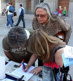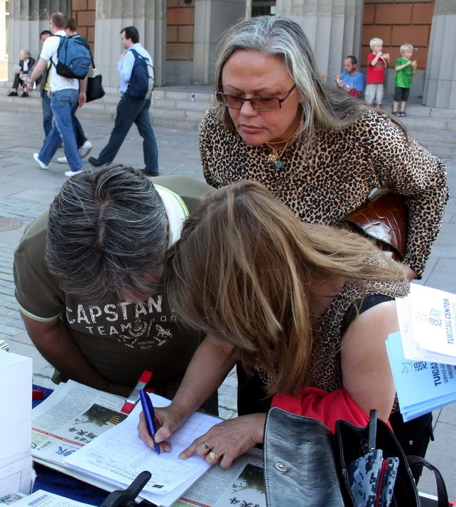 一位来自日本的中年男士当他看到这里在搞退出中共的活动,非常的高兴并竖起了大拇指连声称赞:“好!好!你们一定能成功”!还有一位来自台湾的母亲,她和朋友、女儿一起来瑞典旅游,看到退!党!集会,很是兴奋,她说:“我是一直反对共产党的。共产党迫害法轮功的事我都知道了,我支持你们!他们在签名簿上签了名。