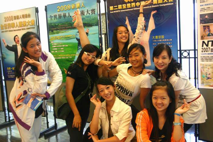![]() 台中市安雅舞蹈艺术中心一行七人由杨雅琪(右后一)带队观赛,他们开心的在大厅海报看板前拍照留影 |