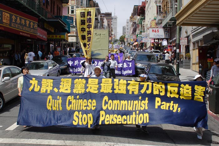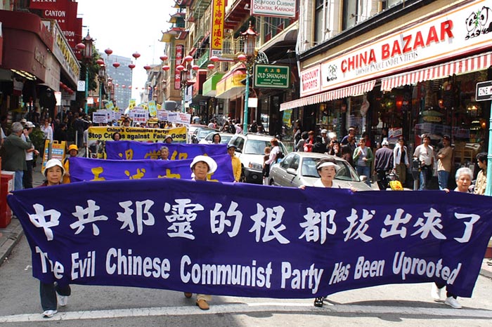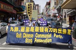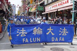 当日旧金山风和日丽,由上百名法轮功学员组成的美西天国乐团前来助阵。中午时分,鼓乐声声由位于旧金山购物中心区的繁华路段都板街穿越而行,然后进入中国城,最后抵达华人聚集的花园角公园。明慧学校的小朋友在此载歌载舞,吸引过往路人驻足观看。