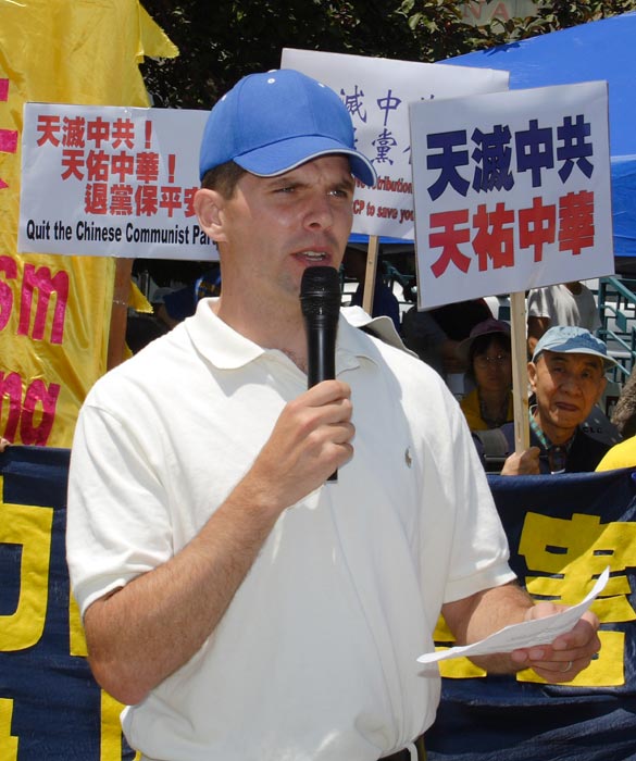 湾区法轮功西人学员、天国乐团指挥亚拉伯罕在集会上讲述了法轮功学员为何支持退!党!。