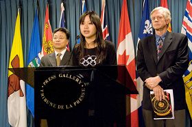 ![]() 记者无疆界加拿大主任凯瑟琳·伯隆甘(Katherine Borlongan)、新!唐!人:电视台加拿大总裁王绍九(后左)和加拿大前亚太司司长大卫·乔高在当天的新闻发布会上 |