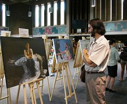 ![]() 艺术系主任肯•科绨斯(Ken Coates)在欣赏法轮功学员的作品。 |