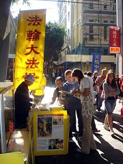七月十六日,明媚阳光、和煦春风下的中国城人山人海,喧闹非凡。法轮功学员们手中举着真相展板,遍地开花,在庞大的流动人群中向人们传播着法轮大法的美好,同时揭露中共九年来对法轮功的残酷迫害。真相展板吸引了大量来往的市民和游客,人们纷纷索要资料,了解详情。有些人不解这么好的功法中共为什么要迫害,学员告诉他们,中共以暴力和谎言维持统治,把人们对“真善忍”的信仰视为威胁,因而发动了迫害。了解了真相的人们纷纷签名呼吁制止迫害,有的团体还与法轮功学员们合影留念。