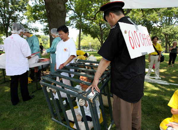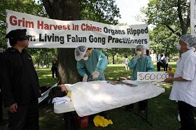 ![]() 集会现场,揭露中共活摘法轮功学员器官的模拟演示 |