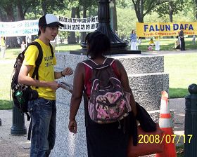 她表示,她最近正好和她的学生们在讨论奥运会的事情。在班级讨论中,学生们分成两组辩论,到底奥运会谁是受益者,谁是受害者,为什么人类体育的盛会在中国举办却受到如此多的抗议。她希望能够逐步的引导学生,让他们明白这是因为共产党统治下恶劣的人权,然而,似乎学生们并不是很理解。今天,看到法轮功的反迫害集会后,她说:“本来我想问那我们怎么帮助你们呢?现在我明白了,我要把这个活生生的例子告诉我的学生们,告诉所有我能够接触的人、其他人权组织,让所有的人都来关注法轮功。”临走时,她索要了很多传单,还留下了电子邮件,希望能够获得更多的信息。