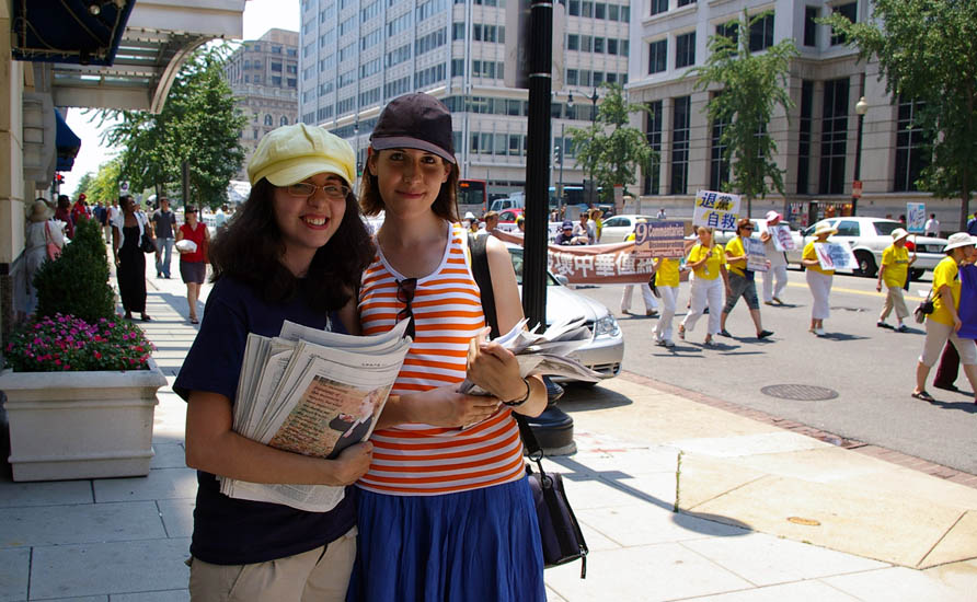 ![]() Madalina(左)和妹妹Diana从加拿大多伦多来到华盛顿,向人们讲述法轮功的真相。 |