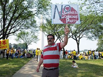 鲍伯是新罕布什尔州一家大公司的项目协调人。他和太太来华盛顿旅游。当经过游行起点华盛顿纪念碑时,鲍伯主动加入,举起抗议中共的标语牌,向来来往往的过路人展示。