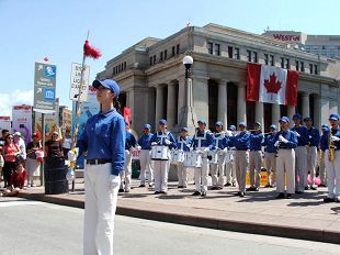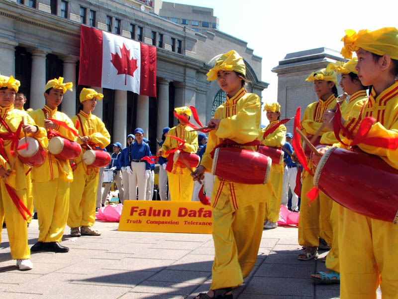 中国传统的腰鼓喜庆、振奋,通过十名法轮功小弟子的演绎更显生机勃勃。传统中国民族舞蹈“山歌”如今被注入了新的内涵,让人们看《·九·评*共产党》、明真相,了解“没有共产党才有新中国”。天国乐团的成员们演奏了“法轮大法好”等曲目。多姿多彩的艺术表演让成千上万的加拿大人驻足留连,更有游客不愿忘记这美好时刻,纷纷同法轮功学员合影留念。