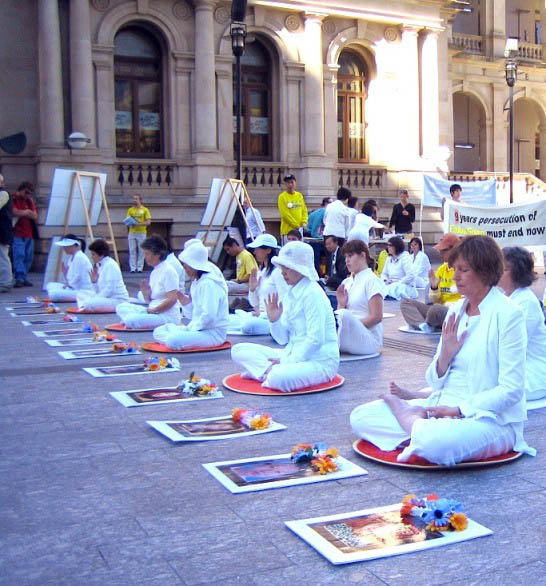 本次活动汇聚了来自昆士兰各地的法轮功学员,包括布里斯本、黄金海岸、阳光海岸、凯恩斯等。上午十点,他们身着全白服饰在广场上静静的悼念九年来被中共迫害致死的数千名法轮功修炼者。