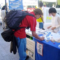 横幅上揭露中共种种暴行的真相标语,句句呼唤着人们的善念;展板上法轮功学员为了捍卫真善忍信仰所遭受无理迫害的图片,唤醒了人们的良知,他们震惊、悲痛,一个个签名支持法轮功。