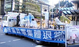 中午十二点,学员们从市中心游行至中国城,并举行勇气长城活动。一路上,由真人模拟展示的反酷刑卡车所带领的游行队伍持续引发人们的关注。
