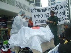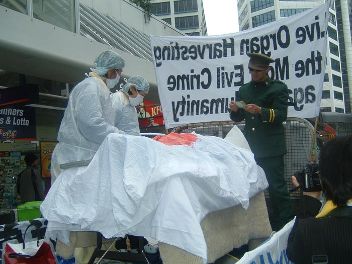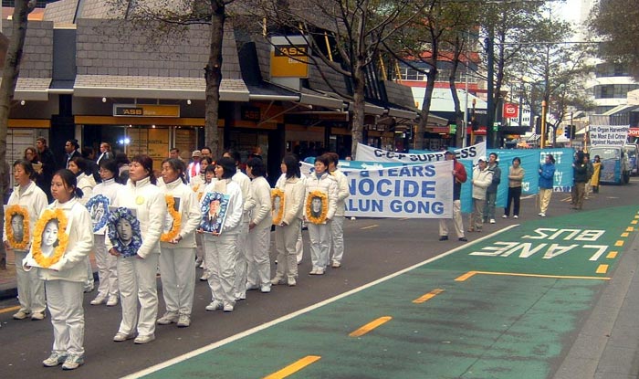 集体炼功之后,“反迫害”大游行开始。带头的是数十位身着白色素服的法轮功女学员手捧被残酷迫害致死的同修的遗像缓缓前行,众多善良的新西兰人都被像队伍所展示出的信息所打动。法轮功学员们还打出了“法轮大法好”、“立即停止迫害”等字样的标语、旗帜和横幅紧随其后,另外法轮功学员还在两辆展示车上以模拟演示揭露中共活体摘取法轮功学员器官的暴行。