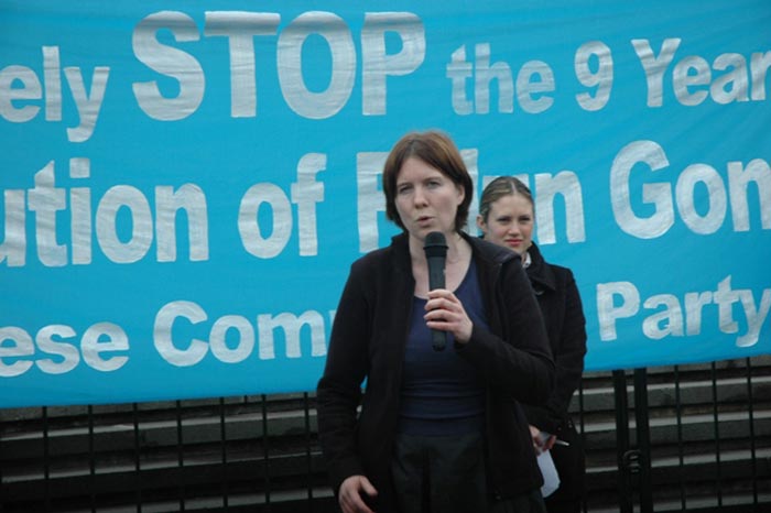 新西兰法轮大法佛学会的邓女士在集会发言中,谴责中共在奥运会之前抓捕大量的法轮功学员,并且在美国纽约导演法拉盛事件。她呼吁立即制止中共对法轮功学员的迫害。