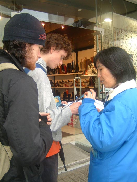 正好是中午时分,许多上班族和路过的当地民众纷纷驻足观看并索取资料认真阅读。一些新西兰人以前并不了解中共活摘人体器官的惊天罪恶,他们非常的吃惊,听完学员讲真相,表示回去后要告诉其他的朋友,并帮助制止这样的反人类罪。人们了解到这场迫害的邪恶之后,纷纷在“百万签名”的征签表上签名,以表达对法轮功的支持。还有早已明白真相的中国大陆同胞悄悄的对学员说:我支持你们,加油。中共太恶太恶,我相信报应很快就要来。