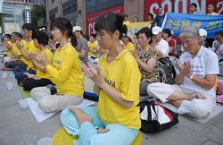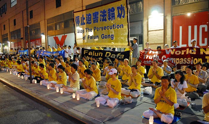 晚上七点至九点的集会上,背景是巨大的横幅书写着中英文“停止迫害法轮功”,两侧是其它各类讲真相横幅,法轮功学员默默的静坐着,长时间的发正念,解体参与迫害的一切邪恶。