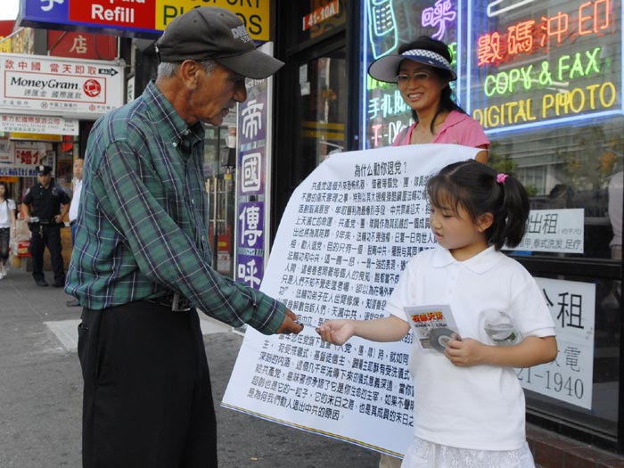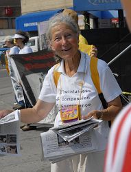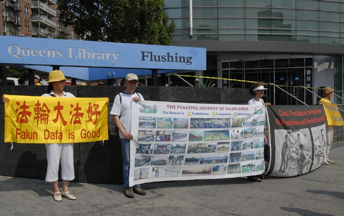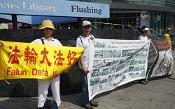 当天,法轮功学员在法拉盛,有的派发法轮功真相资料,展开“法轮大法好”等横幅,及展示中共酷刑迫害法轮功的真相图片。