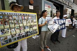 ![]() 法轮功学员向人们展示横幅,反迫害 |