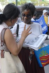 一些中国大陆来的游客一开始不敢接受真相资料。但却静静的听着法轮功学员们善意、和气的讲真相,渐渐的,每个人手中都拿着不同的真相资料,才离开景点。