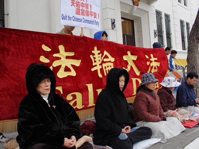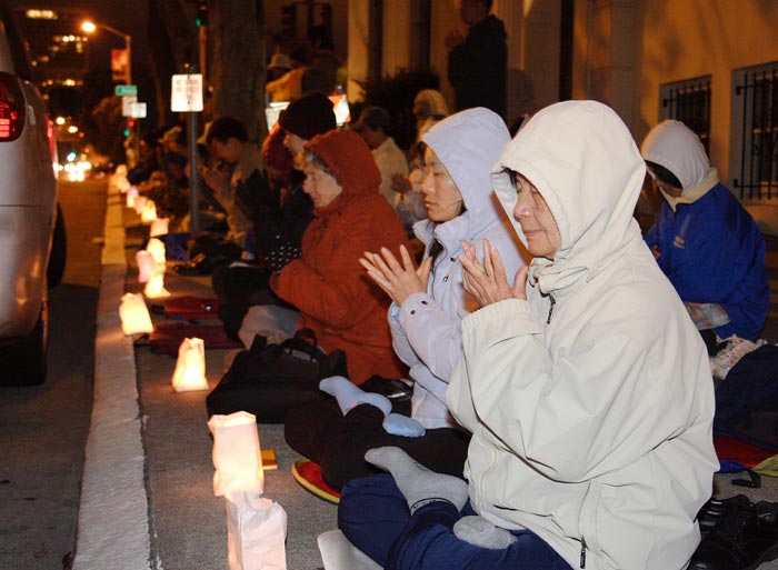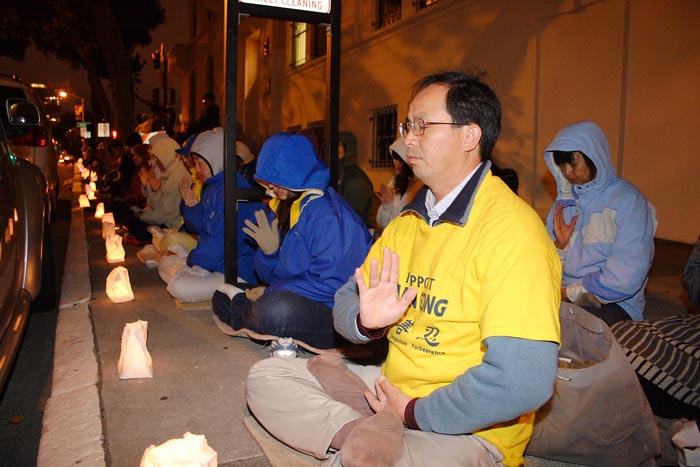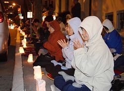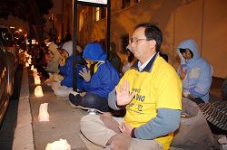 夜幕降临,法轮功学员们静静的坐在中领馆前,无声的表达他们的哀思。同时发出强大的正念,解体迫害大法的一切邪恶。