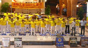 一些民众及部份法轮功学员的家人都参与了活动,晚会中宁静祥和的音乐及跃动的烛光,像在诉说着法轮功坚忍中蕴含的真诚善良,热闹的街道旁端坐的黄色身影,吸引了许多人的关注,也留下了正义的声援。