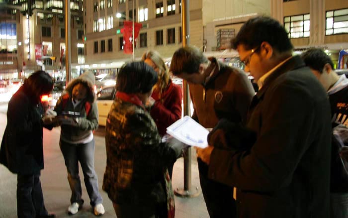 这样的悼念场景吸引了众多过往的路人:他们或驻足聆听讲解,或拍照留下这个瞬间。一位来自阿联酋杜拜的小伙子,名叫穆罕默得,他以前就听说过法轮功,但今天是第一次看到烛光悼念活动,这个场面震动了他的心,他手捧起烛火和学员们坐在一起默默的哀悼,然后拿起真相展板和他的朋友一起参加活动。他和他的朋友都在制止中共迫害法轮功的征签表上签了名,并说要将征签表带回他的国家去,让他们国家的人也签上名,然后传真回来。他向学员要了传真号,并说要帮助传播真相,制止中共对法轮功的残酷迫害。