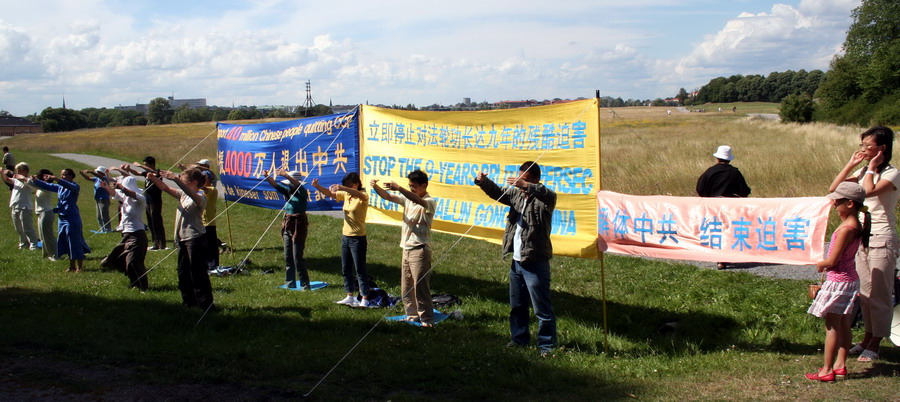 继七月十九日在首都斯德哥尔摩皇宫旁的钱币广场(Mynttorget)举行的反迫害集会后。二十日,法轮功学员又来到了中共驻瑞典大使馆前举行抗议活动。学员们拉开了“结束迫害”、“立即制止中共对法轮功长达九年的残酷迫害”、“声援四千万人退出中共”的横幅,向中使馆里的工作人员及过往的路人讲真相,同时在优美的炼功音乐伴随下向人们演示舒缓、祥和的法轮功五套功法。